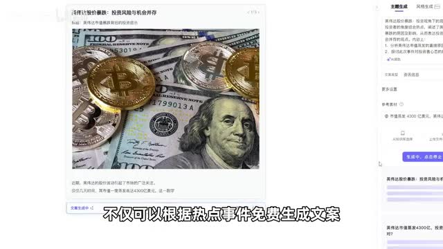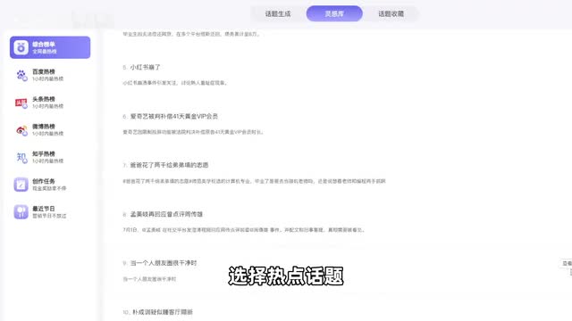 在这里呢你可以根据各大平台的热榜话题去创作,毕竟蹭热点带来的这个流量是很大的。我们只需要在灵感库里面选择热点话题,ai就可以根据这个热点生成多个选题来给你选择,还可以直接生成文章,并且文章中呢还加入了相关。的图片素材非常的省心。