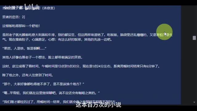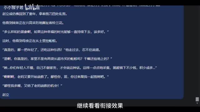 最重要的是小说所有情节和对白都不需要人来构思,让你彻底解放大脑,专注于创作的乐趣。眼见为实,让我们来看看ai的创作实力。这本百万字的小说全部由a i一次性完成,而且内容前后连贯,逻辑清晰。为了方便演示,我将小说分段展示。大家可以看到,即使在断点处,a i也能根据指令完美衔接。