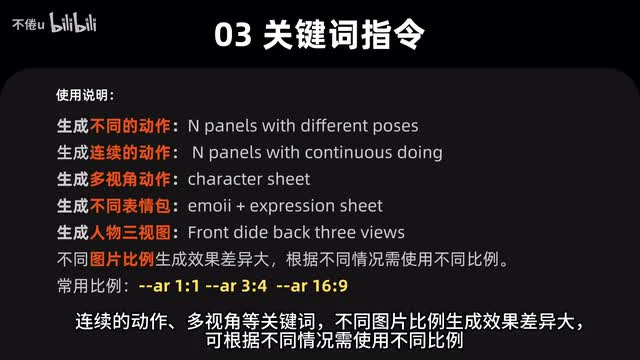 接下来讲解重点部分第四个技巧,魔法指令。可简单理解为连续画面公式由三部分组成,神奇前缀、关键词组、九比十六图像尺寸。通过使用这个公式能生成多张像电影分镜一样的连续性画面。具体操作流程如下,第一步是关键词开头使用神奇前缀,含义是儿童插画卡通动漫角色梦工厂动画的随机电影剧照。第二步,在描述人物动作的关键词中,增加一下人一关键词。
