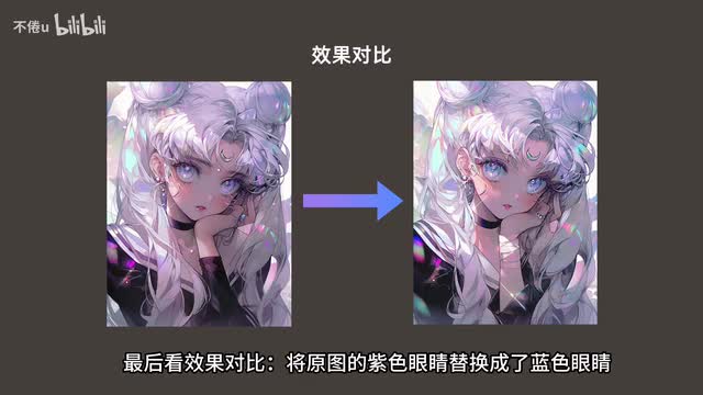 下一步,替换关键词,并在末尾添加思域值重新生成。此时第三张图与原图比较相似,点击u三放大图像。最后看效果对比,将原图的紫色眼睛替换成了蓝色眼睛。接下来再讲解第三个关键词,指令的使用技巧。一共有五组关键词的指令,包含动作、三视图、表情等咒语。