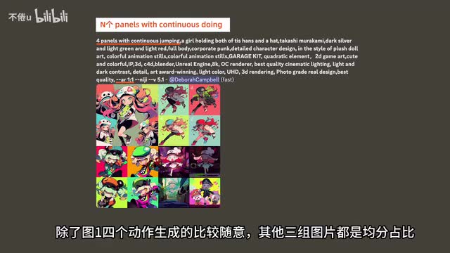 每个角色都有四个不一样的表情动作。再看第二个是生成四个连续跳跃的动作,关键词是正品,图片比例为一比一。除了图一四个动作生成的比较随意,其他三组图片都是均分占比。请注意,在使用panel命令有时在十六比九比例下会失效。例如,与上一个案例是同样的关键字,仅修改了图片,比例为十六比九。