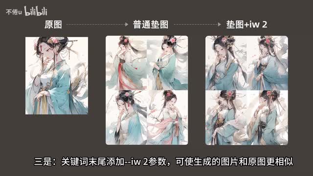 下面介绍五种技巧的使用方法。第一个点图技巧。在基础课程有简单介绍过几种电图的使用方法,感兴趣可以去看看啊。此次案例需要参数i w的配合使用及图片链接加关键词加一个六二。这是效果对比图,普通电图不添加i w生成图片与原图差异会大些。