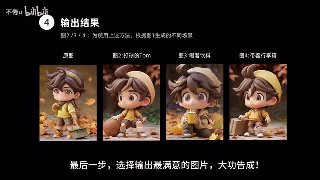 最后使用微调参数,多次调整出图。生成的效果图,使用这个公式可以保持人物一致的情况下微调,改变角色的动作或环境。该方法适用于多种风格和形象,可作为通用公式使用。详细的操作流程如下。先给角色起名,通过关键词生成多组参照图,在他们之中挑选几张形象类似的放大作为备用图。