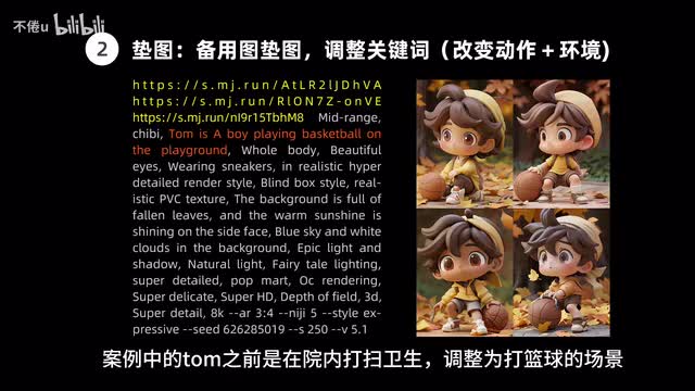 下一步为备用图垫图前面提到的技巧,灵活运用某种关键词可以改变动作和环境。案例中的他们之前是在院内打扫卫生,调整为打篮球的场景。其中最难的部分就是参数微调。不同角色风格对技巧运用各异,一次出图可能性很低。理想结果需多次迭代,花费时间抠细节。