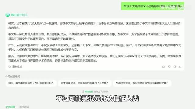 它们分别是百度的文心一言,阿里的通义千问,腾讯的会员助手。以及最近在b站存在感很强的kimi chat,大伙也可以自己玩一玩。考验一,理解能力大家平时总说中文顺序颠倒不影响理解,那是因为人脑有一定的联想能力,能根据上下文理解句子,那现在的人工智能能理解这样的句子吗?首先考下百度的文心一言。好的,上面就显示目前提问的人数过多。