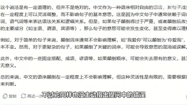 而在尝试多次以后,他终于有了回应,好在他不仅理解了这句话,而且还内容延伸,并针对这句病句给出了解释。不过他似乎认为这句话是正确的。得扣点分数,然后是腾讯混元助手,虽然同样正确理解了这句话并做出了解释,不过可能是会员比较信任人类,所以他在做总结引述的时候一样照搬了我的原句,并没有纠正句子里的错误。接下来是通义千问,他的回答非常正经直白,先给你一个结论,然后举个例子,做了一定的内容延伸,但它跟会员助手一样,同样也没对我们的提问进行纠错。