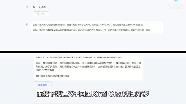 就是在光头洗头环节,kimi chat则有了不一样的看法,他觉得两者都是可以的,并且觉得如果头皮较油用洗发水,如果头皮敏感也可以用洗面奶,似乎还有点道理,很新颖,不知道有没有专业同学讲一下这观点合不合理?看来,在吸纳了弱智班的训练语料后,各家ai回答其弱智班儿的陷阱问题似乎都相当有一套考验三,图文几何题看到这里,是不是觉得我提的题目太简单了,那好,我们来一道简单的高中几何题吧,既考验图文识别能力,又考验解题能力,最后还有个标准答案。我心想,这下总能试出他们谁更强了吧。然而结果却让我大跌眼镜,文心一言从图片识别部分就出了大问题,也就是说正方形a b c d位于正方形c e。g f内部一会儿又说两者相交是个矩形,全程都在滔滔不绝的胡言乱语,要不是知道正确答案,我差点就给他照进去了。