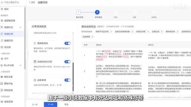 最后再融合起来,概括其故事脉络,形成大纲,这样就能生成其对应的训练数据了。接下来就是在训练后台一键创建数据集,上传到千盘平台。由于一些小说数据中有外站网址和特殊符号,为了避免影响性能,可以基于平台自带的数据处理功能来清洗小说数据。待在数据处理完成发布后,最后一步就是训练了模型选择。