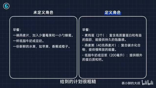 在这个计划里,他明确的告诉我应该吃几顿,每顿吃什么,以及具体是多少,并且告诉我为什么要这样吃吃这个东西的目的是什么?为了方便对比,我们单独把早餐计划拿出来看一下,在没有做角色定义之前,给到的计划很粗糙。比如应该吃一碗麦片,但完全没有告诉我一碗是多大一碗。在角色定义之后,他告诉我要吃两个鸡蛋。四十克麦片以及二百毫升的低脂牛奶或者豆浆,并且告诉我吃燕麦片是复合碳水化合物,提供慢释放的能量等等。