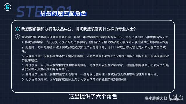 在不知道扮演什么样人的时候,我首先应该问ai我想要解读和分析化妆品成分,请问我应该咨询什么样的专业人士?他就会给到我一个答案。这提供了六个角色,我觉得这六个角色都挺不错的。我们选第一个,化妆品化学家。那问题来了,如果只是给一句,请你扮演一个化妆品化学家,显然是不够的。