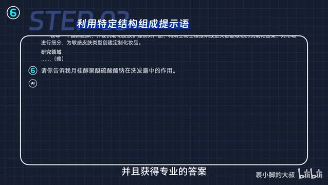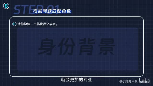 我们这样提示a i请帮我虚构一个化妆品化学家的身份背景,要包括教育背景、职业资格、职业经历和研究领域,你就会得到一个很全面的角色背景信息。第三步就是利用特定结构组成提示语。我们选取其中的部分信息,根据特定结构写一个背景信息赋予的提示语。这个特定结构包括两个部分,第一个部分是一句话,就是请你扮演一个化妆品化学家。