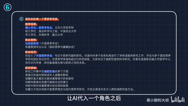 第二个部分就是具体的背景信息,包括四个部分,分别是教育背景、职业资格、职业经历和研究领域。在设定好a i的身份背景后,现在你就可以提出你真正想要问的问题。并且获得专业的答案。总结一下a i的角色设定,提问有四个步骤,分别是根据问题匹配角色,虚构角色身份背景,利用特定结构组成提示语,最后是提出你这样想要问的问题。