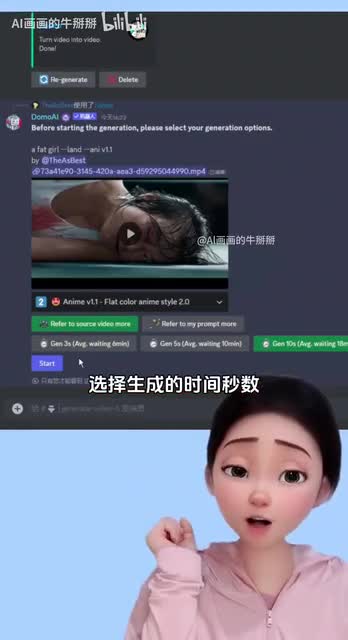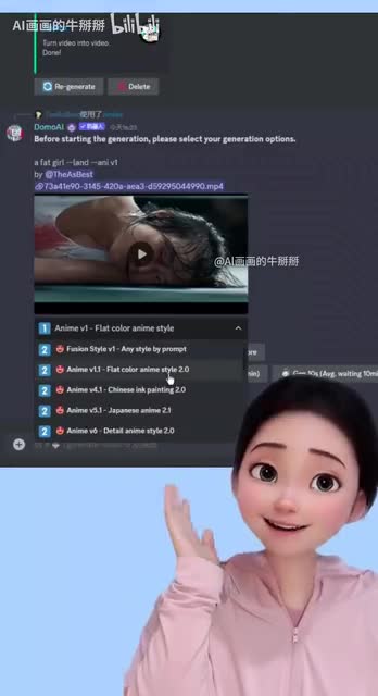 这里我们上传你要转化为动画片的原视频,在后面简单的输入一下描述的关键字,比如说a bad girl。然后发送指令。紧接着它会出现一个让你选择的对话框,看这里我们可以选择不同的动画形式。