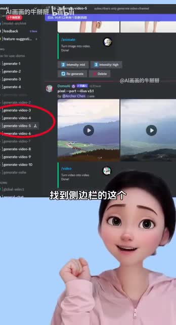 首先我们来到discord。在左边找到绿色按钮,探索公开服务器,要在这里搜索登录a i选择这个加入进来,找到侧边栏的这个generate video,随便点一个频道进去,然后我们就可以开始制作a i动画了。在动画框中输入斜杠video就会跳出一个框。