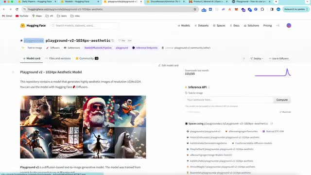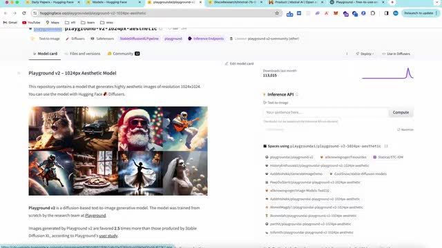 然后啊他最近发布了一个新的模型啊,叫做playground v two一零二四p x啊。这个模型最核心的东西啊还是这个resolution一零二四乘一零二四。那你说这个一零二四乘一零二四对标到底是谁呢?对标的就是stability ai的这个s d x l是吧?那它就是瞄准了这个呃。stable diffusion这个x l去去打的啊,他希望能够在产品的能力上,这个stability ai地区产品力上没有其他的东西强了。嗯,这这我个人是觉得playground的这个产品力还是很强的。那如果说stability ai它的呃这个模型的能力也没有。