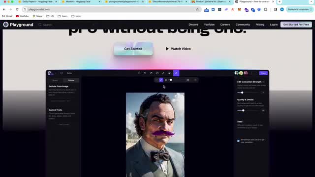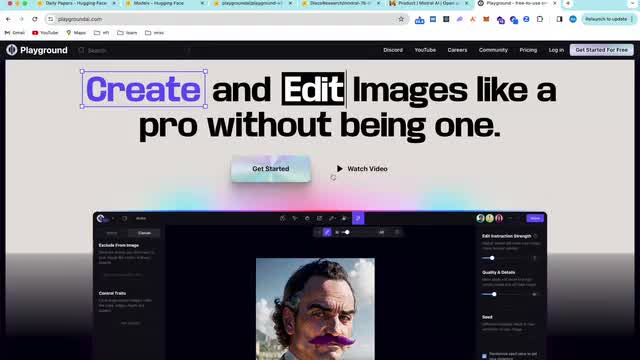 那第二个有趣的应用啊,是这个playground的这个嗯应用吧,或者是这个网站。这个网站其实和呃stable diffusion的那个clip crop啊做的是一个类似的事情。或者说是他跟这个photoshop做的是一个类似的事情。他想做一个基于stable diffusion更加专业的绘图工具,绘图软件啊这个。它比stable diffusion厉害的地方是在于它的产品力,它比photoshop更厉害的地方,它对于diffusion的这个理解能力。