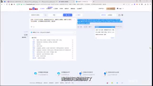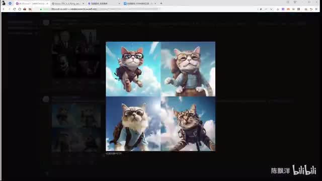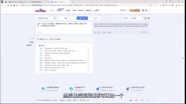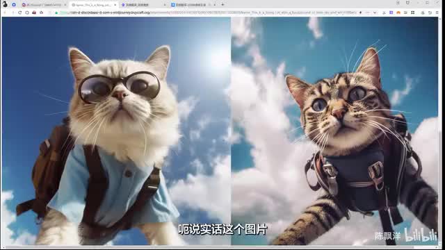 比方说我们这里的话,就是我描述一下啊,这是一只正在飞行的猫猫。背景是蓝天和白云。戴着飞行眼镜。背着飞行背包。他。