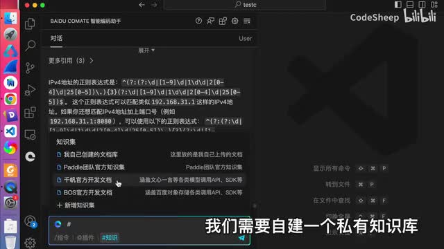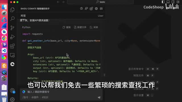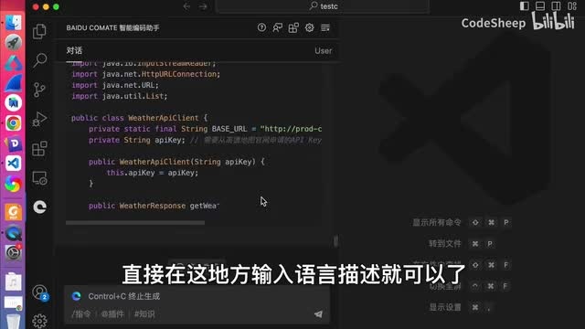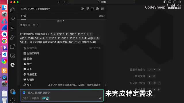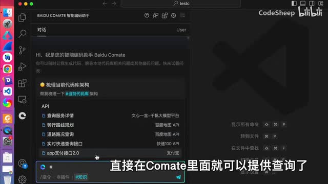 这次新版com的呢就是跟a p i对话了,它内置了很多业内公开a p i。我们点击这个知识,然后这地方有个a p i可以检索相应的api并且呢可以基于a p i文档来生成调用代码mock数据甚至是测试用例啊,这就很方便了对吧?比如我想找某个a p i的调用方式和数据构造,就不用再去各种搜了,直接在comment里面就可以提问查询了,对吧?比方说我们输入这个天气查询,哎,这里就有是吧?然后呢生成这个接口的调用代码就可以了。哎,他就会去思考啊、解析啊、检索啊,然后一步一步来生成对吧?这还不算,你还可以指定特定的语言或者框架呢来进行条件约束。比如呢我想指定对吧?用加入语言来实现这个月口。