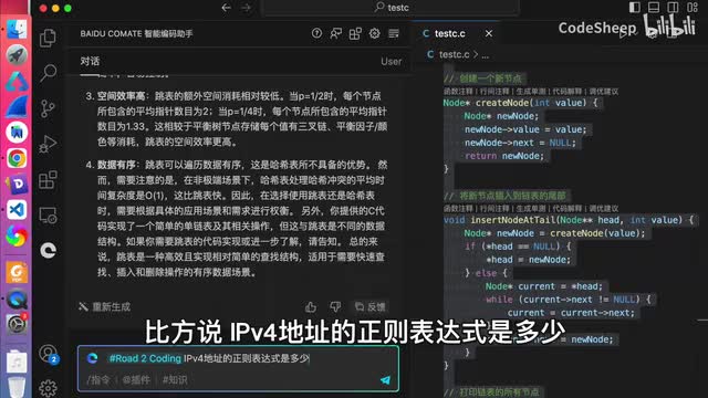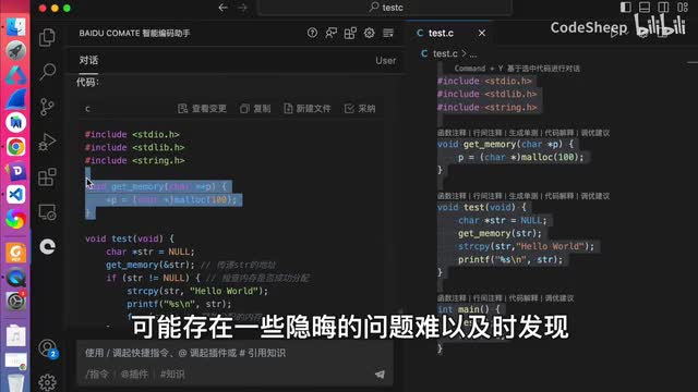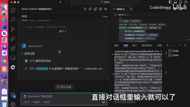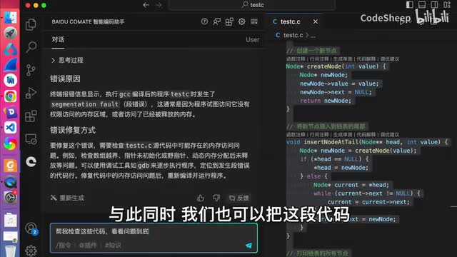这个代码呢可能是很多c语言初学者会遇到的一个问题,对吧?我们选中代码,在这个输入框中直接对它进行提问就可以了。可以看到common的准确的找到了问题所在,对吧?就是指针使用错误以及空指针所可能导致的问题是吧?同时呢command还详细给出了优化的代码,这还不算,他甚至还给我们详细解释了一通,对吧?什么我们看不懂。所以呢这东西就非常有意义了。做开发的同学都知道啊,写代码容易优化代码的,而且重点是呢所写代码中可能存在一些隐晦的问题,难以及时发现,一旦上线了往往就翻车了,是吧?那好,当我们遇到这些担心时啊,我们不妨可以选中相应的代码,把代码扔给这个坑来把一把关,让他给我们一些优化的建议啊,以帮助我们避雷,对吧?然后第三点要聊的呢,就是command对于代码的一般有查错能力啊,作为示例啊,我们这地方写了一段c代码就是链表,对吧?很简单,这个代码乍一看呢可能看不出来有问题,但是一旦运行起来呢,这个控制台呢会报错。