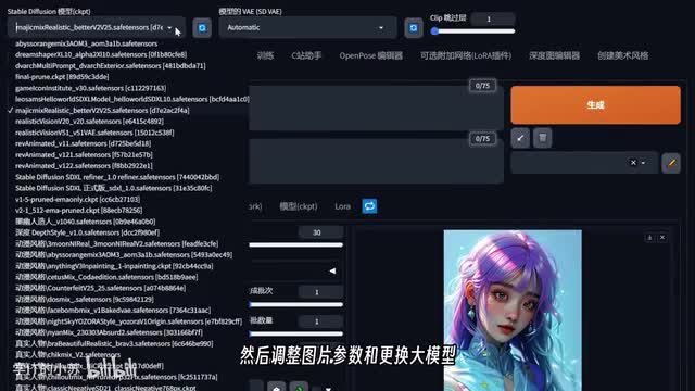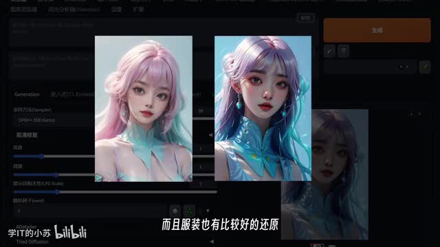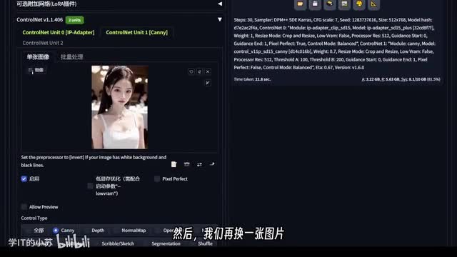 我专门选了一张风格比较明显的女生,然后我们调整预处理器和图片尺寸,最后点击生成按钮。可以看到,生成的人物不仅头发颜色、动作姿势类似,而且服装也有比较好的还原。接着我们再添加一张新图片到control net中,选择kenny作为控制方式,并推荐把控制参数调低一些,大约零点七,最后点击生成按钮。