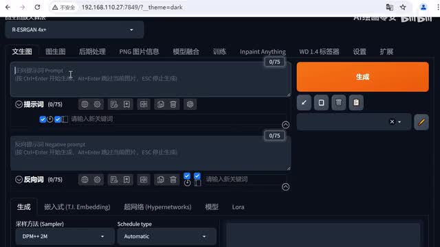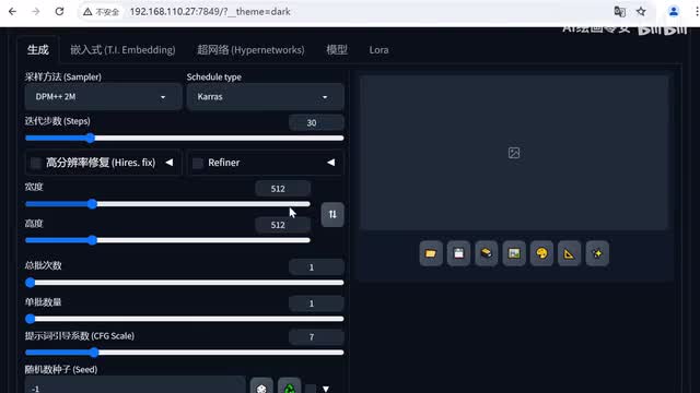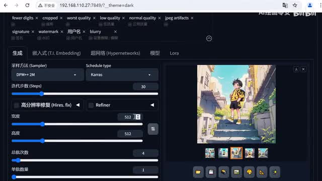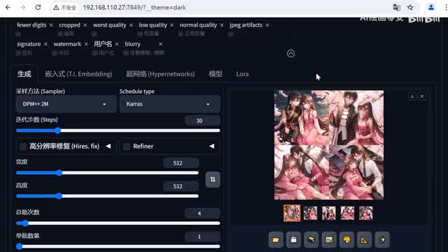接着我们来到参数部分,采样方法,我会选择d p m加加二m cards。然后迭代步数我们调整至三十。宽度和高度,这里我推荐五幺二乘以五幺二总批次数我们可以调成四。接着点击了让模型。我们选择这个古风类的loa。
