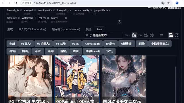 这里呢我给大家演示一下不同类型的loa生出来的漫画效果是什么样的。在大模型这里我们要选择一个偏动漫风的大模型。提示词部分,这里我已经提前准备好了不同laura风格所对应的提示词,你们可以直接照抄我的。另一个提示词是形容古风的。然后我们给他添加一些基础型首饰盒。