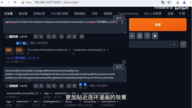 需要注意的是这个连环漫画我们还需要给它添加一些触发词,才能让它生成的效果图更加贴近连环漫画的效果。我们将它复制上去,如果我们想要生成有色彩的连环漫画,可以将这个单色图片去掉。
