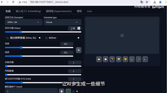 提示组部分完成之后,我们来到参数部分打样方法我们选择d p m加加二m carrots迭代步数我们调高一些,将它设置成三十,让a i多生成一些细节图片的尺寸。这里呢我们可以将高度调高一些,我将它设置成了幺零二四,其他参数我们保持默认就行了。