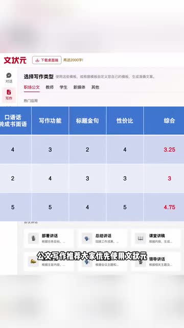 所以在这个环节他们的分数分别是,整体看下来,相信大家也觉得很直观了。公文写作推荐大家优先使用文状元,而且在价格方面也相对更加划算。