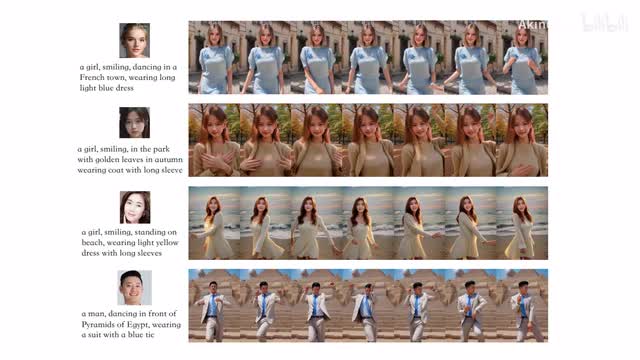 比如一位穿着白色西装和短裤的长发女性走在街上。对于生成人物,可以指定五官面容,将头像的图片以及文字提示词作为输入,就可以生成这个人的动态视频。比如一位身着西装,佩戴蓝色领带的男士在埃及金字塔前跳舞。不只是五官,还可以指定服饰,比如同一个人穿着不同的衣服,在不同的场景中跳舞。
