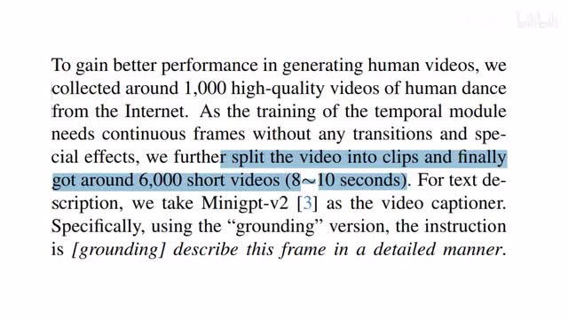 再来看阿里巴巴dream moving,我们在周报中有介绍过这个可控视频生成框架和dream moving针对以人类为中心的内容生成,根据人物的身份和动作序列来生成高质量定制化的人类跳舞的视频。dream moving基于stable diffusion模型打造,团队从互联网收集了一千段高质量人类舞蹈视频,并分割成大约六千段时长在八到十秒钟的不包含转场和特效的短视频来进行训练。模型使用video control net来控制动作,使用cotta guider来保持人物身份,也就是人脸和衣着的一致。当输入是文本提示词的时候,dream moving可以按照要求生成动态的人物和背景。