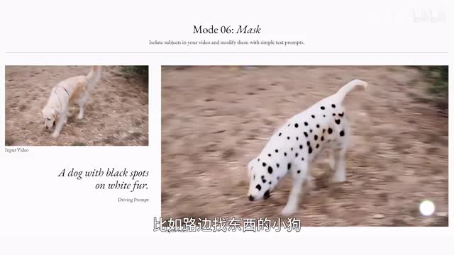 四是风格效仿,将任何图像或提示词描述的风格移植给自己的视频。五是故事版,story's board可以对模型样板进行风格和动画渲染。六是面具,musk可以将视频中的某个主体分离出来,比如路边找东西的小狗,并通过文本提示词对它进行修饰或者改造,比如让它变成白皮、黑斑点的小狗。七是渲染render,可以通过图像或者提示词的输入来让没有添加纹理的渲染,也就是entex trate renders变成真实感较强的输出。