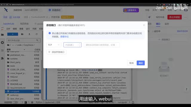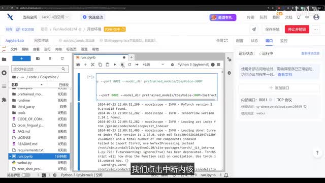 我们先看cosy voice啊,运行方法很简单,进入目录里啊,找到run,点i p i n b文件,打开它,找到运行运行所有单元格,稍等片刻后看到这个u i l就表明运行成功了。我们点击右侧的端口,添加端口,输入我们启动的这个八零八一端口用途,输入web u i,点击确定,打开这个外部访问地址,就能看到我们启动的服务了。这就相当于把这个服务放到了公网上,任何人拿到这个地址都能访问你部署好的这个服务。我们先看预训练音色的使用输入法。合成文本点击生成音频,稍等片刻就能听到合成后的音频了。