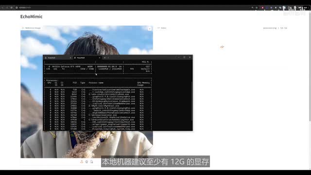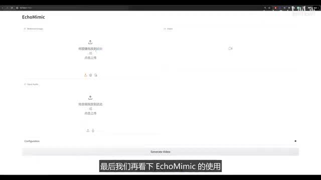 点击start就能识别出对应的文本了,这个识别的准确率还是挺高的。其实呢这个可以结合cos boys一起使用,把sense voice识别的文本结果啊当做prompt的输入,这样就不用人工听录音识别啊并手动输入文本了。怎么样放audio m的使用,大家学会了吗?最后我们再看一下echo magic的使用,这个使用起来很简单,直接上传一张图片和一段音频,点击生成按钮就能生成对应的合成视频了。这里需要注意的是输入的图片尺寸尽量是幺零二四乘幺零二四的,否则呢你可能会遇到一些奇怪的报错。这个算法用起来还是很简单的。