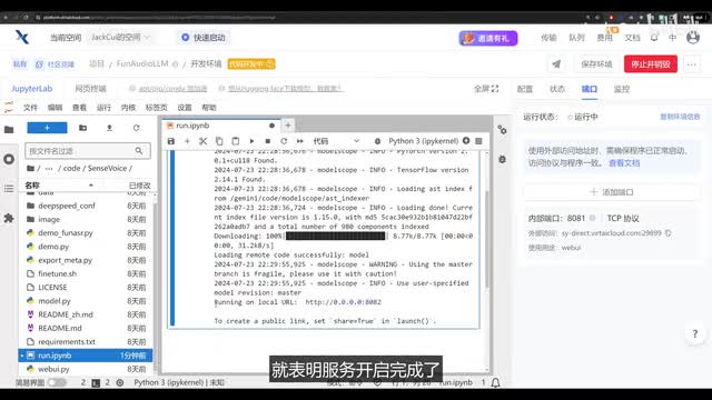 这里就不过多演示了,我们接下来再看一下sense box,这个使用方法更简单啊。还是打开软件i p y n b文件运行所有单元格。当我们看到这个u i l的时候,就表明服务开启完成了。我们还是打开右侧的端口,输入我们新的端口八零八二,用途呢还是web u i点击确定,打开这个链接就能看到开启的服务了。我们上传一段音频,然后。