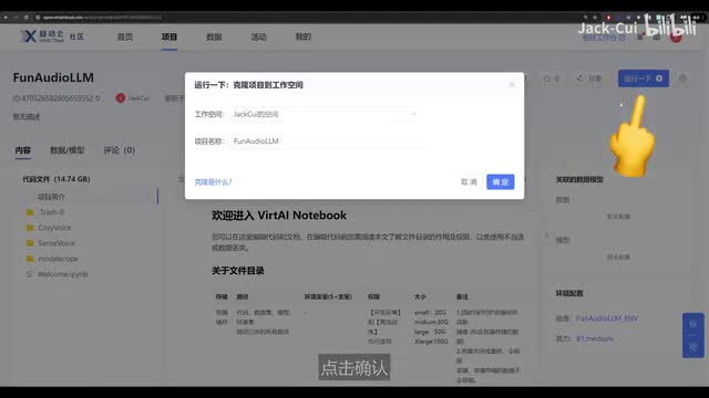 驱动云的注册链接我放到了视频的简介里,有需要的自取。我们点击社区选择项目,搜索饭audio l m就能找到我为大家准备好的一键镜像了。点击进入,选择运行一下,点击确定就能看到项目正在克隆中,选择立即运行就能启动这个项目了。等待部署完成后呢,点击进入开发环境。饭audio m分为两个部分,cos voice和sets voice。
