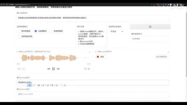 修改推理,随机种子还能抽签改变不同的音色。除了使用预确定音色,也可以三秒急速复刻。我们上传一段音频,点击开始按钮可以听一下声音,然后就可以休息一下,跟伙伴们一起玩玩。然后我们在prompt里面输入这个音频对应的文字,注意要有标点符号。然后再输入合成文本里输入我们想要合成的文字,点击生成,稍等片刻啊,就能听到复刻的音频了。