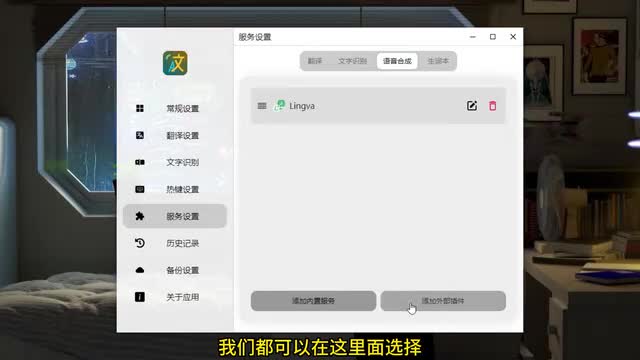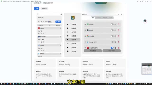 打开这款软件以后,我们可以看到它有一些常规设置和翻译设置文字识别的。这些其实都是后话。在安装这款软件以后,我更加推荐大家看一下这个服务设置里面。它包含了一些翻译的接口,必应的翻译,谷歌翻译这里面都是有的。
