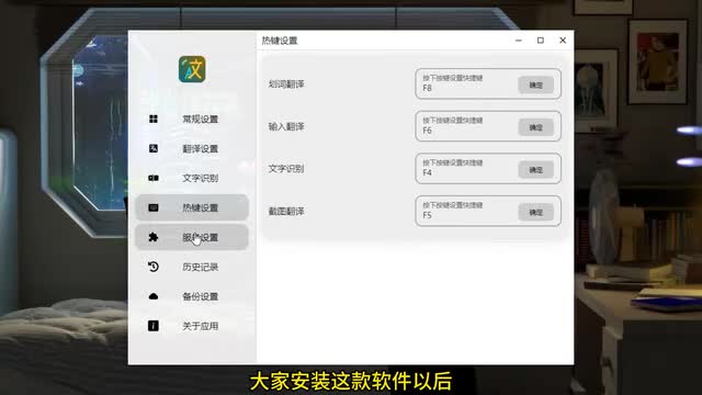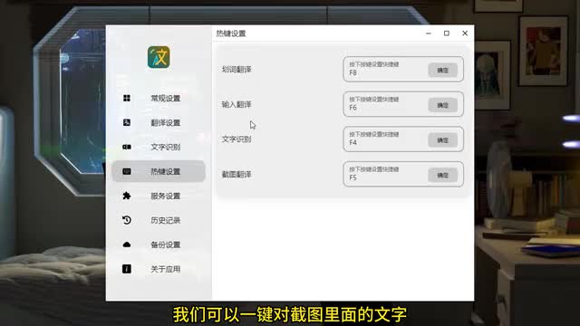然后更加推荐大家对这款软件进行一个热键设置,就是快捷键进行设置。我们可以一键对截图里面的。文字进行翻译,或者是对图片进行文图片里面的文字进行提取。这里还是非常推荐大家进行一个设置的。