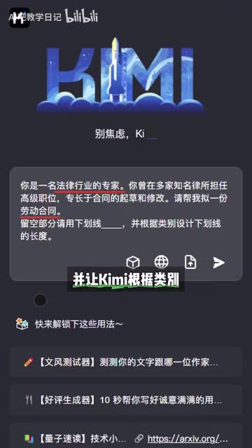 kimi打开屏幕上的网址,下拉找到kimi,打开kimi后输入提示词,定义kimi为法律行业的专家,以劳动合同为例子,并让kimi根据类别设定留空部分下划线的长度,发送给kim。还可以继续提问,追加需求,然后让kimi合并文本。