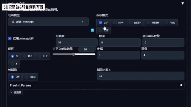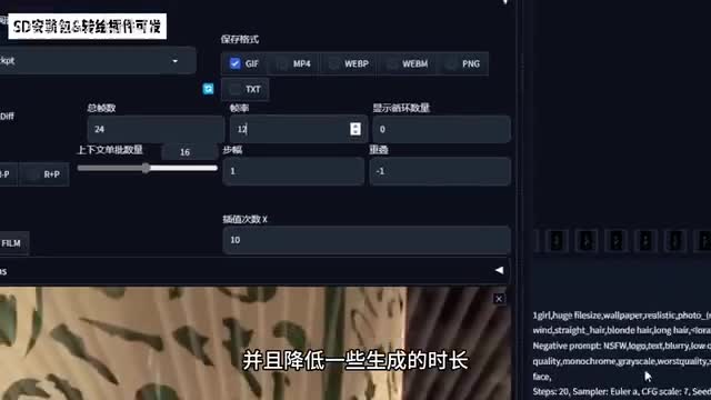 这个我们后续再来说。好,那现在可以看到这个视频里面其实已经有这个效果了,这是我之前测试的视频。好,那在这边把提示词和常规生图的参数设置好了之后,我们就可以来到animated dif里面选择相应的模型,选择保存格式,然后设置帧数帧率等等。但现在我们是用视频转换成动画,所以说我们直接把我们需要转会的视频直接放到这里来,它就会填上你这个视频的总帧数和帧率。那为了节省一些显存,并且降低一些生成的时长,我是建议你把这个视频呢在剪辑软件里面先把它的帧率和时长降低。然后后续呢可以通过一些插帧的操作,或者说还有一些其他的a i工具,比如说tobes或者说adobe的p r里面也有一些插件可以对视频进行插帧。那这里的话我就是二十四帧,然后十二的帧率,然后准备对它进行生成。那为了尽可能的去控制图面的效果,我们也可以打开c t r n e t。
