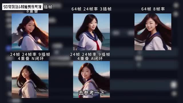 比方说在这里我是加上了hair is blue by the window,也就是头发被风吹动。那视频的效果就从这样变成了这样,还是相当不错的。好,那这就是一个非常简单的纹身动图或纹身视频的工作流。好,那现在的基本操作已经完成了,所以我们来看一下它这里面的参数设置。那首先这个动画模型和保存格式这些我们都说过了,所以不再重复。我们主要看这个上下文单批数量,这也是animate d f插件里面最重要的一个参数。那我们刚才生成的时候,可能有的小伙伴眼睛比较细,已经看到了类似于这样的画面,就是直接出现了一个十六宫格的图片。那它就是根据这个十六直接一口气生成十六张图片。