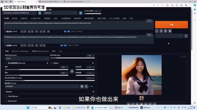 那这里的话我就选择使用dream shapers八了。好,然后写上一些相应的提示词和反提示词,再设置一下参数,基本上都是默认的。然后呢我们先不打开animate t diff,先跑出一张正常的图片来,然后再去生成视频或者说动图。好,那这边图片出来了之后,我们就滑到下面,打开any mate diff把它展开,然后勾选上启用,选择一个模型,那这里我就使用v三模型。保存格式我就用g i f,当然你也可以根据需求保存成不同的格式。然后这边的话为了查看方便,我就先不保存编辑了,就光看一个g f就行了。有需要的话也可以勾选上。然后这边的话总帧数的话是十六帧,也就是会有十六张图片,帧率八,也就是说每秒会有八张图片,那么总帧数十六,也就是说现在会生成一个两秒的减f。