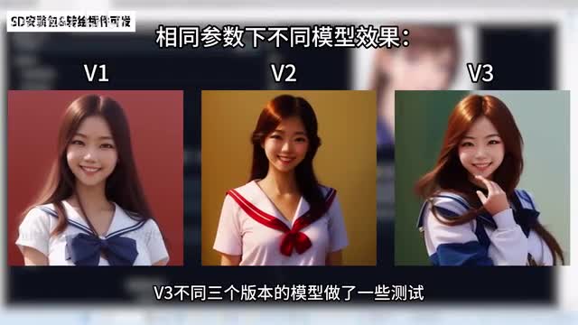 然后这个时候你展开就能看到你这边的模型了。那这边有的模型是针对x l的那现在是显示不出来的。如果说你是换成x l的话呢,在这边也可以使用x l的运动模型。这边的话我也对v一、v二、v三不同三个版本的模型做了一些测试。那大家可以看到在v一上面有一些很糟糕的水印会出现。那v二v三模型的话,根据个人不同的喜好,你也可以灵活选择。那有的人说v二的运动效果会比v三更好,或者说色彩效果更好,那这个的话就见仁见智了。咱们在这不去过多的讨论。