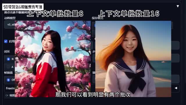 那因为它这十六张图片是一个批次里生成的,所以说它能保证比较好的连贯性。那这个参数是不是越大越好呢?当然不是。如果说参数给的过大的话,会导致显存增加,甚至你的图直接就出不来了,就直接报显存了。那这个参数如果你把它设置的比较小的话,比方说设置为八,那大家可以看一下上下文,单批数量为八的时候是这样的效果,那就是八张图一个批次。那我们可以看到明显有两个批次,并且这两个批次之间几乎没有什么关联了。当然我们这边就保持十六就行了,因为这也是作者建议的参数。因为作者在训练这些运动模型的时候,他也是用十六真的运模型来进行训练的。当然我也在一些社区和论坛里面看到说,当这边的总帧数是六十四的时候,把这边的上下文单批数量改到十二,会有一些神奇的效果,效果会非常的好。