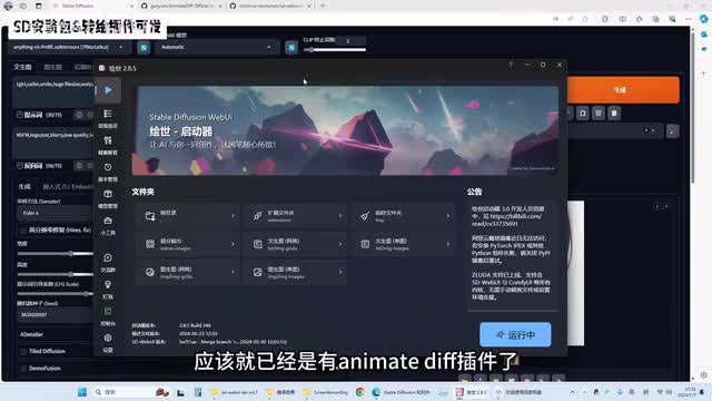 ok那多的不说了,咱们就直接开始。ok那现在的话我们就来看一下具体的操作。那首先的话还是安装,那安装的话我们这里还是以秋夜启动器为例。那如果说你是最新版本的话,现在打开s d web u i应该就已经是有animate dif插件了。如果没有的话,你可以尝试一下更新s d web u i。那如果说还是没有的话,你可以来到版本管理里面点击安装新拓展,然后搜索animated diff第一个就是它了。然后点击安装,然后再启动你的s d web u i,然后下滑你就能看到animate diff了。展开就能看到里面的详细参数。