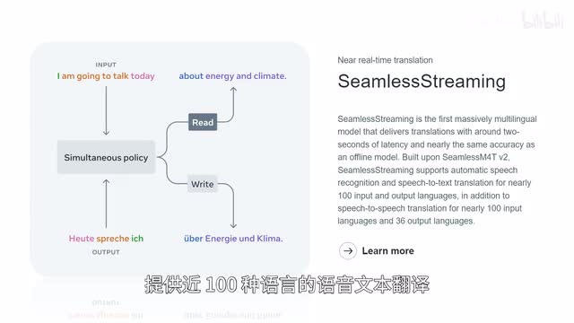 呃,系列模型还包括similar streaming无缝传输模型,能够以大约两秒钟的时间提供近一百种语言的语音文本翻译。它可以智能地决定什么时候有了足够的输入,形成了语言背景,进而可以输出目标语言的文本或者语音。