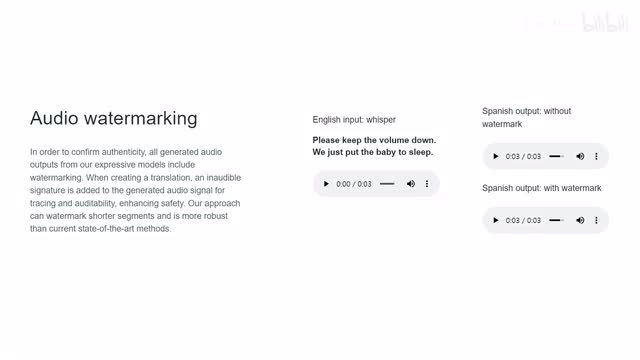 当用户创建翻译的时候,生成的音频信号上会附加一个人耳听不到的签名,保证音频内容可追踪、可审核,进而提升安全性。比如这边这个spanish alpha西班牙语的输出,一个是呃不带水印的,一个是带水印的,两个听起来真的是呃一样的ok呃。