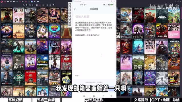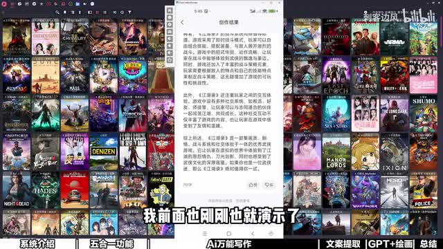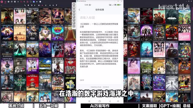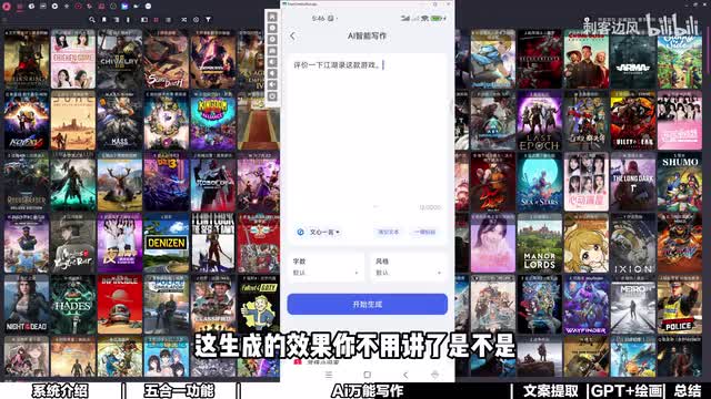我们这里就简单以默认的为例,那我们就随便问他一个,比如说最近刚推出来的这个新游戏啊,这个很多小伙伴应该秒懂啊,然后呢点击它会自动来生成,来感受一下,告诉我什么叫做惊喜,来自己感受一下。这是一款让人沉醉的武侠世界探索之旅,在浩瀚的数字游戏海洋之中,江湖路犹如一。颗璀璨的明珠,哇,这个磁力好优雅呀。首先画质堪称一绝,这个我之前测测评过了,非常不错。它实际上是将三d风格和那个水墨,就是那种山水画的那种风格相融合,有一点像那个三国志十一的那种结合啊,然后呢,设计的风格很有意思。