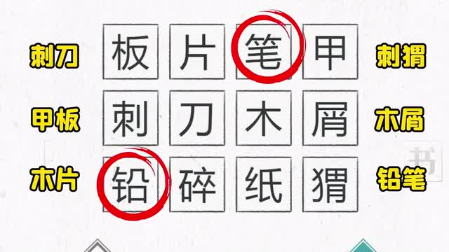 哎呦,这张图看着好像铅笔屑啊,不过这有两个格子,所以说肯定不是啊。刺刀、夹板、木板、刺猬、木屑、铅笔,这里面最不可能的就是这个刺猬了吧。没错,嘿嘿,那咱就猜是刺猬。哟还真让我蒙不对,让我推的对了啊,死鬼。